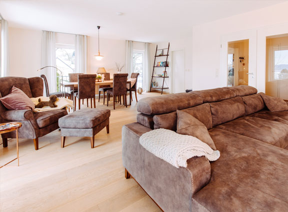 Das Echtholzparkett verleiht dem gesamten Haus ein besonders wohnliches Ambiente. Machen Sie es sich mit einem Buch im großzügigen Wohnzimmer gemütlich oder genießen Sie einzigartige Sonnenuntergänge von der großen Terrasse aus.